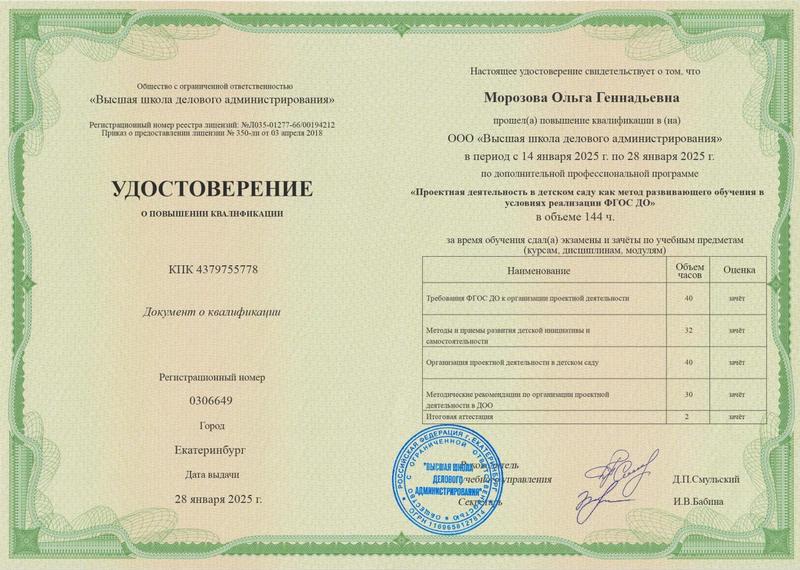 6.АНО ДПО "Инновационный образовательный центр повышения квалификации и переподготовки "Мой университет"" по программе повышения квалификации "Организация развивающих игр в ДОУ как эффективная форма реализации ФГОС ДО" (108 часов) 2022г.